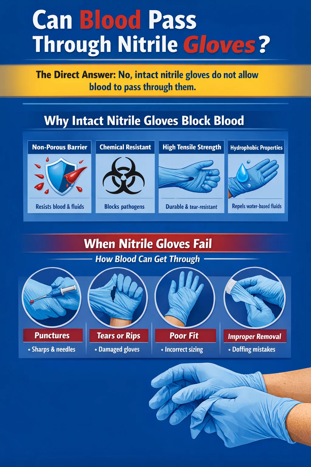 В нормальных условиях, неповрежденные нитриловые перчатки не пропускают через себя кровь. Нитриловый каучук — это плотный синтетический материал, который образует постоянный барьер против жидкостей, включая кровь и другие жидкости организма. Это одна из основных причин, по которой нитриловые перчатки стали доминирующим выбором в медицинских, лабораторных и аварийных ситуациях во всем мире.