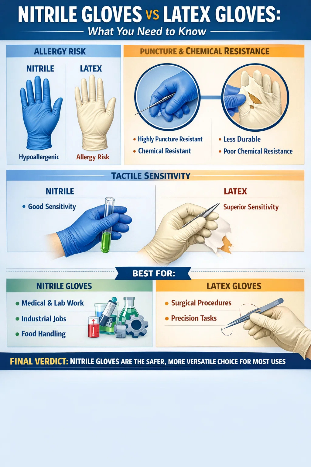 Если вы взвесите риск аллергии, устойчивость к проколам, химическую стойкость, долговечность и направление институциональной политики здравоохранения во всем мире, Нитриловые перчатки выходят вперед как более безопасный и практичный выбор для подавляющего большинства случаев использования. . Устранение риска аллергии на латекс само по себе является достаточно убедительным для большинства учреждений здравоохранения, предприятий общественного питания и промышленных предприятий, чтобы стандартизировать нитрил.