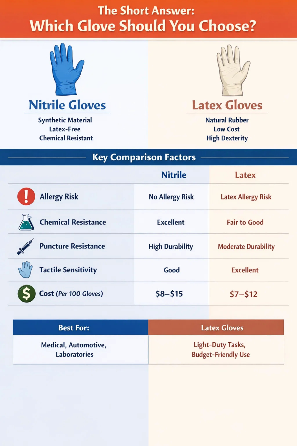Нитриловые перчатки и латексные перчатки служат схожим целям, но существенно различаются по составу материала, риску аллергии, химической стойкости и стоимости. Если у вас или окружающих есть аллергия на латекс, нитриловые перчатки — очевидный выбор. Если стоимость является основным фактором, а аллергия не является фактором, латексные перчатки все равно могут подойти для легких задач. Сегодня для большинства профессиональных сред, включая медицинские, автомобильные и лабораторные, нитриловые перчатки стали доминирующим стандартом, и на это есть веские причины.