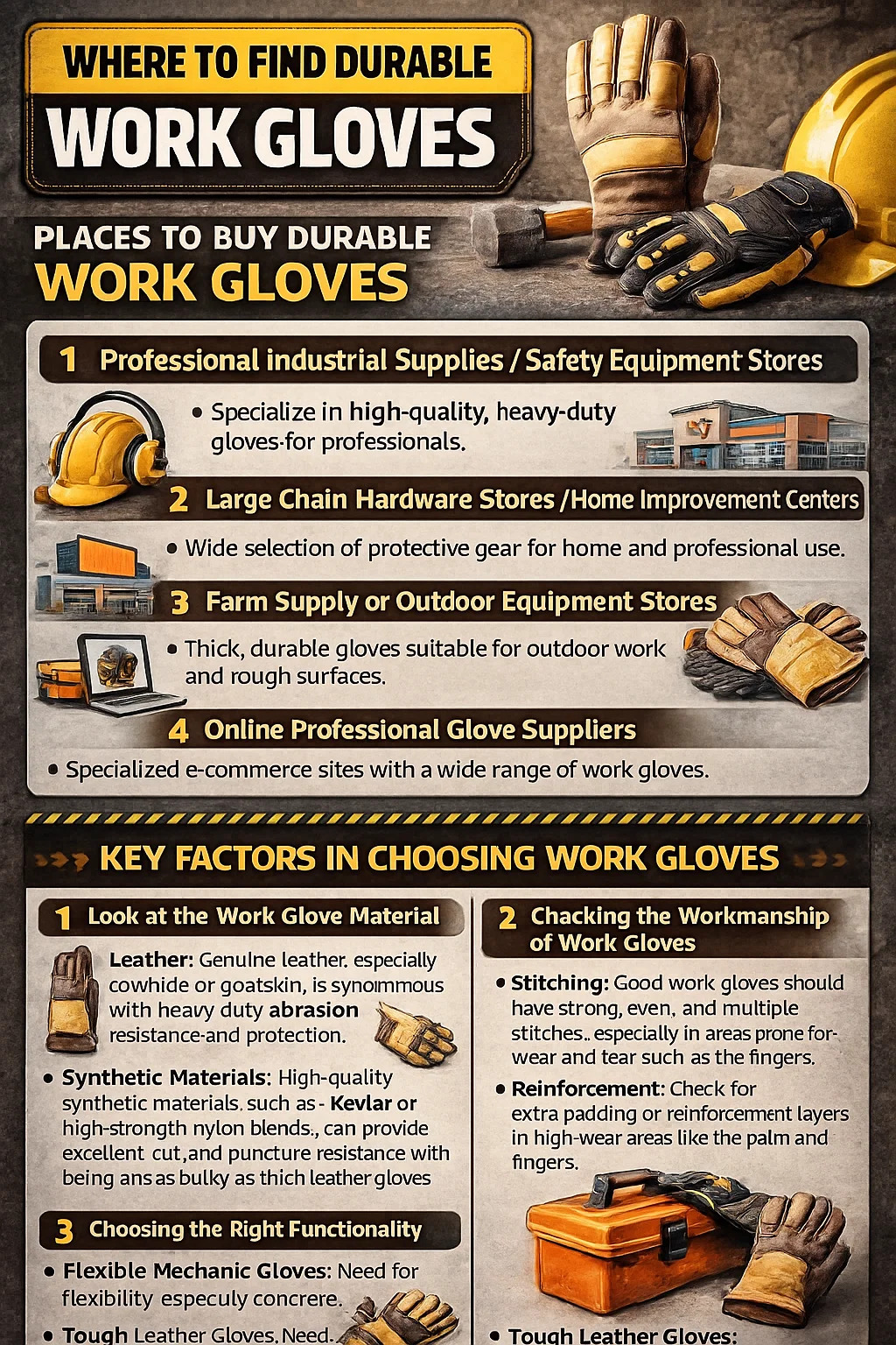 Эти магазины не так распространены, как обычные розничные магазины, но они специализируются на поставках профессионалов в строительстве, производстве и других отраслях, где требуются прочные перчатки.